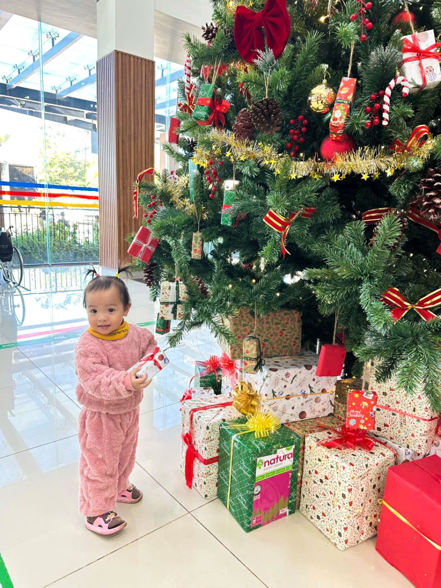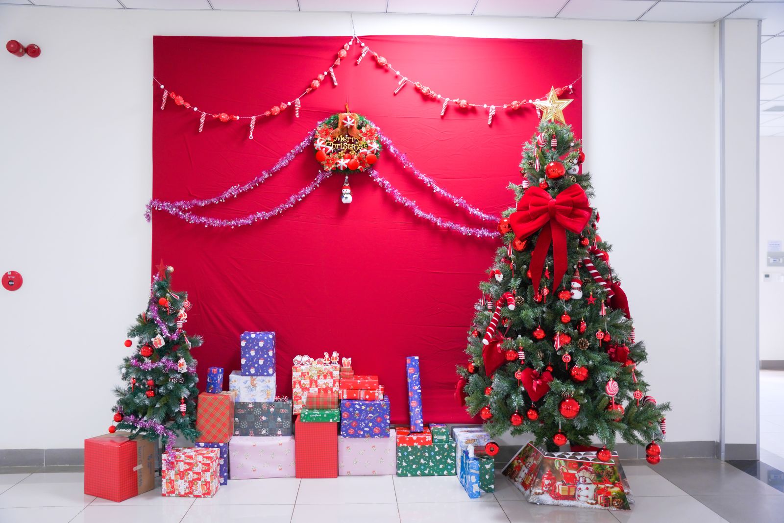 Từng hạng mục trang trí được đội ngũ nhân viên chuẩn bị tỉ mỉ và đầy tâm huyết. Cây thông Noel rực sáng giữa sảnh chính với ánh đèn lung linh, sắc đỏ – xanh truyền thống và những phụ kiện quen thuộc như quả châu, dây kim tuyến, hộp quà nhỏ… tạo nên một không gian sống động và đậm chất Giáng sinh.