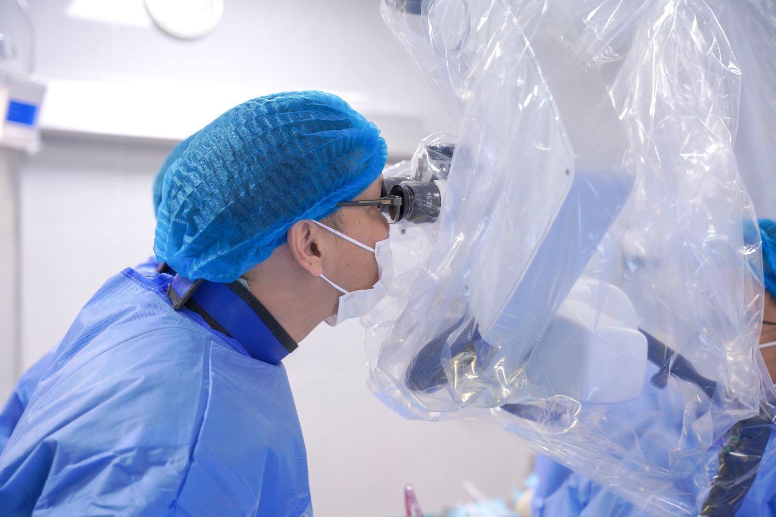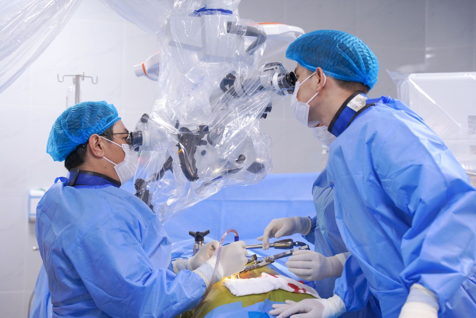 Trong quá trình phẫu thuật, ê-kíp đã ứng dụng các kỹ thuật hiện đại trong đó có kính vi phẫu ZEISS TIVATO 700, cho phép phóng đại trường mổ và quan sát rõ từng cấu trúc thần kinh – mạch máu. Nhờ đó, quá trình bóc tách, giải áp và cố định cột sống được thực hiện với độ chính xác cao, hạn chế tối đa tổn thương mô lành – yếu tố then chốt trong các phẫu thuật thần kinh phức tạp.