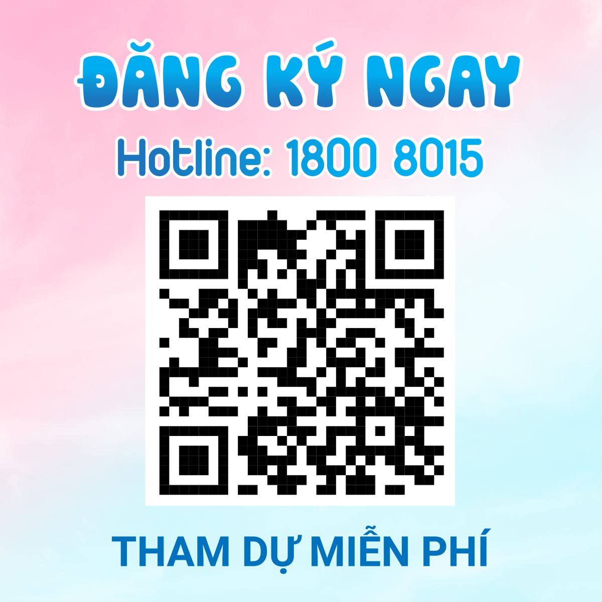 Ba mẹ vui lòng liên hệ số Hotline: 1800 8015 (miễn cước) hoặc quét mã QR code trong hình phía dưới để đăng ký nhé!