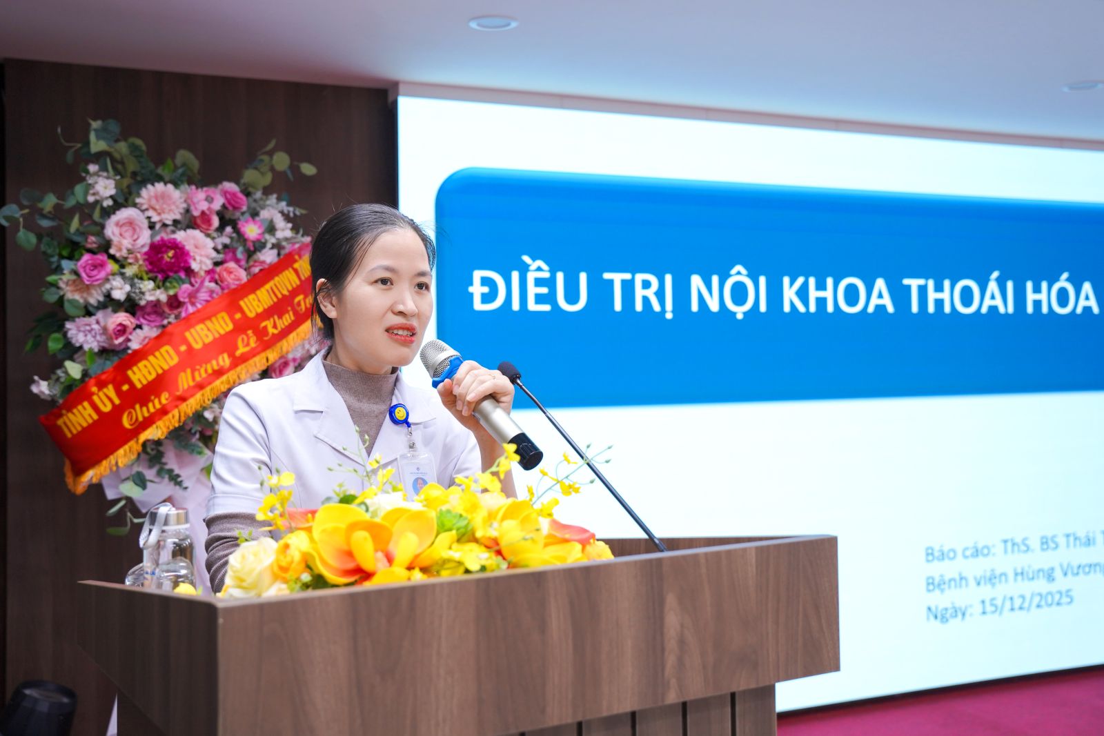 Tại hội thảo, ThS.BSNT Thái Thị Thùy Linh – Phó trưởng khoa Nội Tổng hợp – Tim mạch đã báo cáo chủ đề “Cập nhật điều trị nội khoa thoái hóa khớp gối”. Nội dung báo cáo tập trung phân tích các phương pháp điều trị nội khoa hiện nay, từ kiểm soát triệu chứng đau, giảm viêm, cải thiện chức năng vận động đến việc cá thể hóa phác đồ điều trị phù hợp với từng giai đoạn bệnh và thể trạng người bệnh. Báo cáo cũng cập nhật các khuyến cáo mới, nhấn mạnh vai trò của điều trị sớm, phối hợp đa mô thức và theo dõi lâu dài nhằm làm chậm tiến triển của bệnh thoái hóa khớp gối.