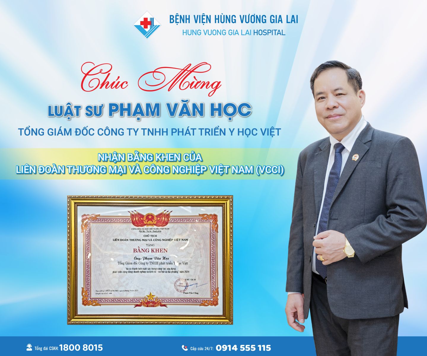 Với những đóng góp bền bỉ trong hành trình phát triển kinh tế - xã hội và đồng hành cùng cộng đồng doanh nghiệp Việt Nam, Luật sư Phạm Văn Học – Chủ tịch Hội đồng thành viên, Tổng Giám đốc Hệ thống Y tế Hùng Vương, kiêm Tổng Giám đốc Công ty TNHH Phát triển Y học Việt vừa vinh dự được Liên đoàn Thương mại và Công nghiệp Việt Nam (VCCI) trao tặng Bằng khen “Đã có thành tích xuất sắc trong công tác xây dựng, phát triển cộng đồng doanh nghiệp và kinh tế - xã hội tại địa phương” năm 2024.