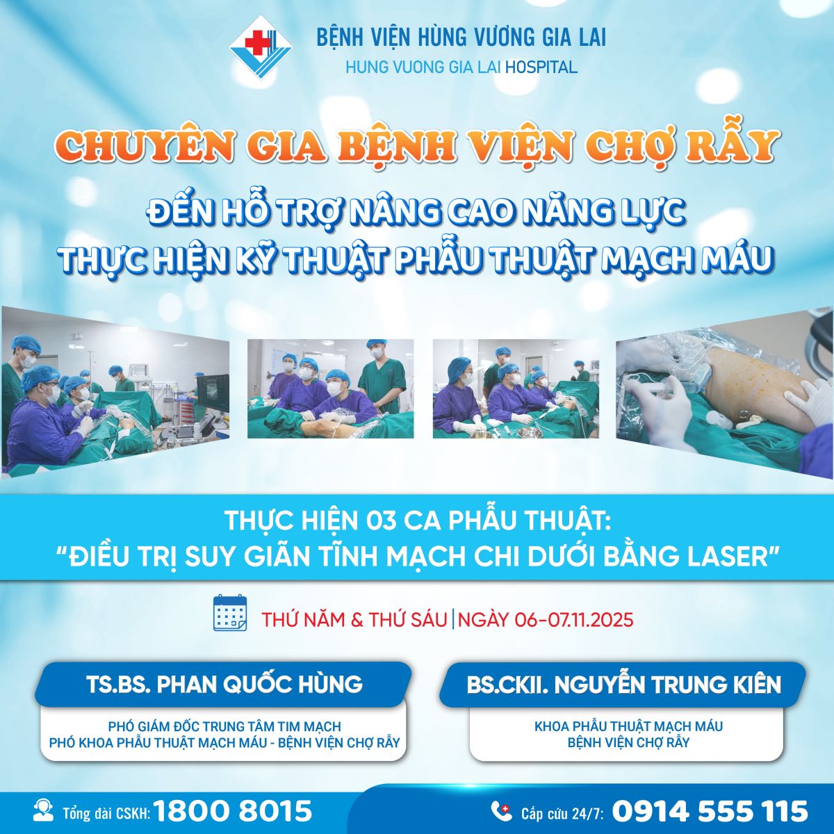 Trong 02 ngày 06 – 07/11/2025, TS.BS Phan Quốc Hùng – Phó Giám đốc Trung tâm Tim mạch, Phó Trưởng khoa Phẫu thuật M.ạ.c.h m.á.u và BS.CKII Nguyễn Trung Kiên – Khoa Phẫu thuật M.ạ.c.h m.á.u, Bệnh viện Chợ Rẫy sẽ đến Bệnh viện Hùng Vương Gia Lai để phối hợp cùng đội ngũ y bác sĩ khoa Ngoại Tổng hợp thực hiện 02 ca phẫu thuật “Điều trị suy giãn tĩnh mạch chi dưới bằng Laser”.