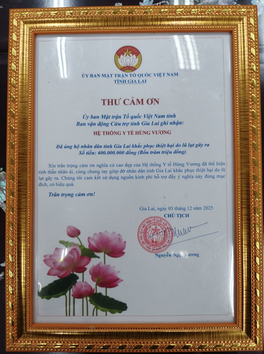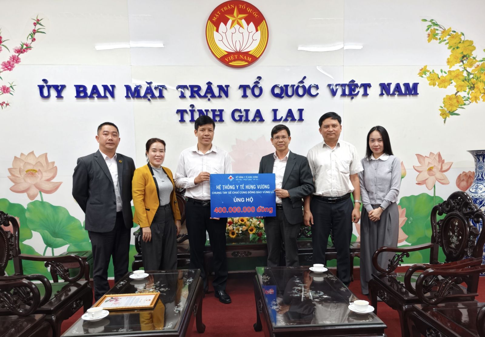 Sáng ngày 03/12/2025, tại Trụ sở Ủy ban Mặt trận Tổ quốc Việt Nam tỉnh Gia Lai, đại diện Hệ thống Y tế Hùng Vương gồm ông Nguyễn Thi – Phó Tổng Giám đốc Thường trực và BS.CKII Bùi Viết Hoàng – Chủ tịch Công đoàn cơ sở đã trao tặng 400.000.000 đồng để hỗ trợ người dân Gia Lai chịu ảnh hưởng nặng nề bởi mưa lũ.