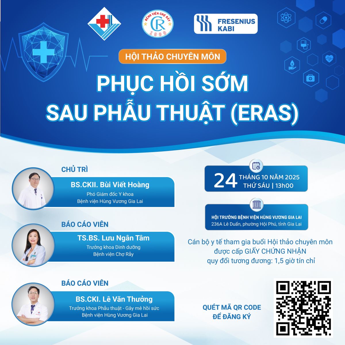 Nhằm cập nhật kiến thức và nâng cao trình độ chuyên môn cho đội ngũ nhân viên y tế trong công tác khám, chữa bệnh, Bệnh viện Hùng Vương Gia Lai trân trọng thông báo tổ chức Hội thảo chuyên môn với chủ đề: “Phục hồi sớm sau phẫu thuật”, cụ thể như sau: