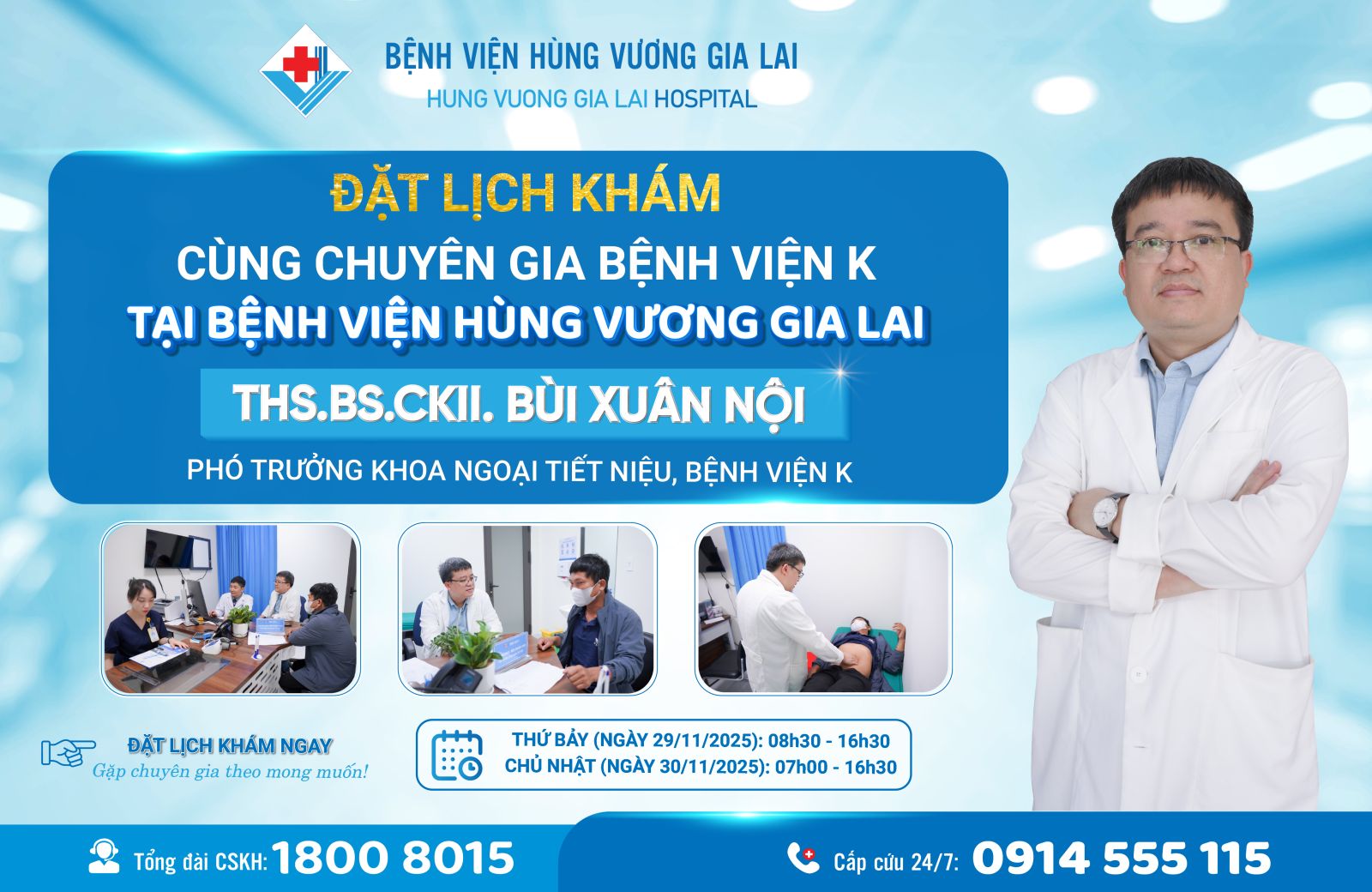 Với mong muốn cung cấp dịch vụ y tế uy tín, chất lượng cũng như tạo điều kiện thuận lợi cho quý khách hàng trên địa bàn tỉnh Gia Lai và khu vực lân cận có cơ hội được khám trực tiếp với các chuyên gia giàu kinh nghiệm, Bệnh viện Hùng Vương Gia Lai thông báo lịch làm việc ThS.BS.CKII Bùi Xuân Nội – Phó Trưởng khoa Ngoại Tiết niệu - Bệnh viện K (Trung ương), chuyên khám tất cả các mặt bệnh về U.n.g B.ư.ớ.u. Cụ thể như sau: