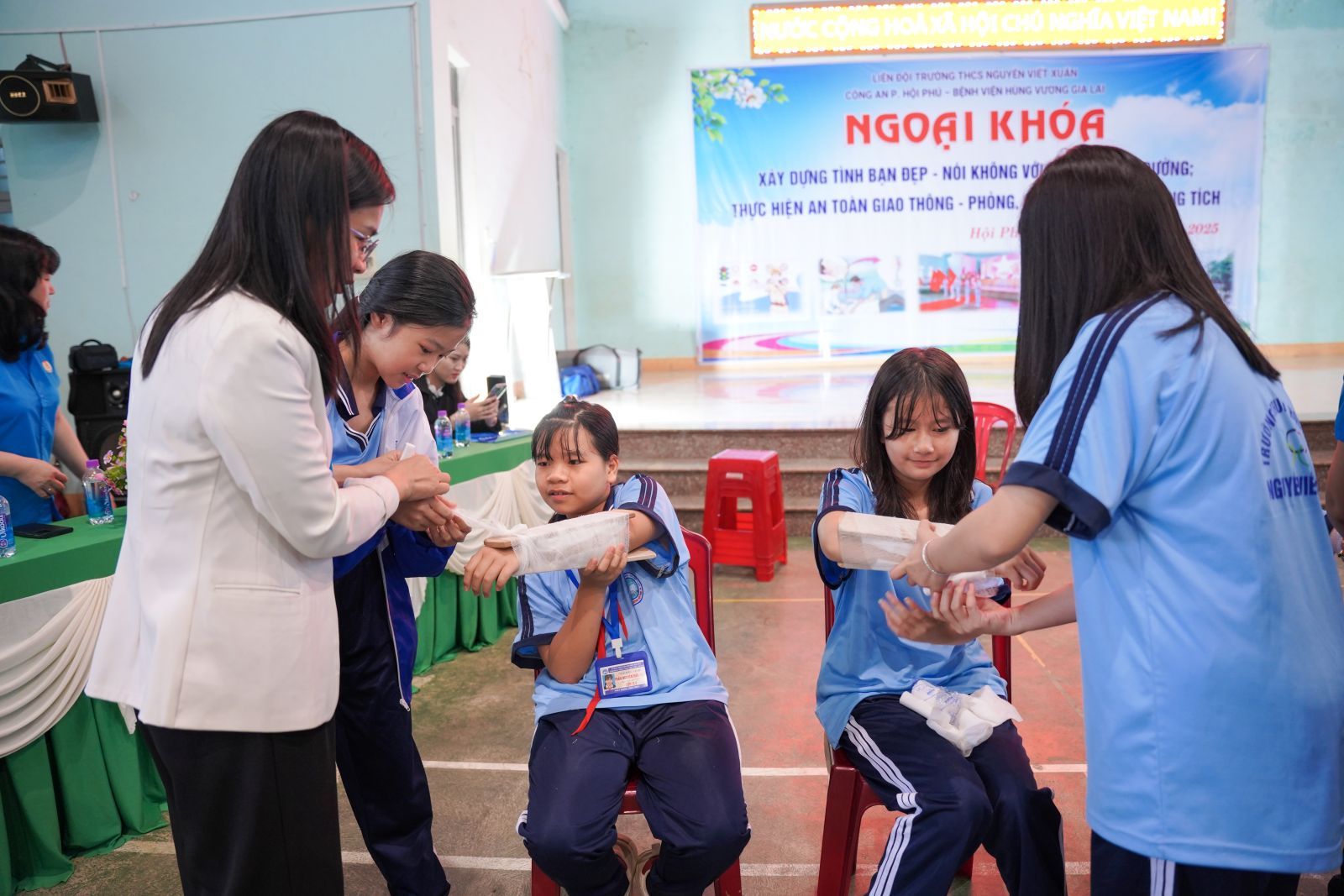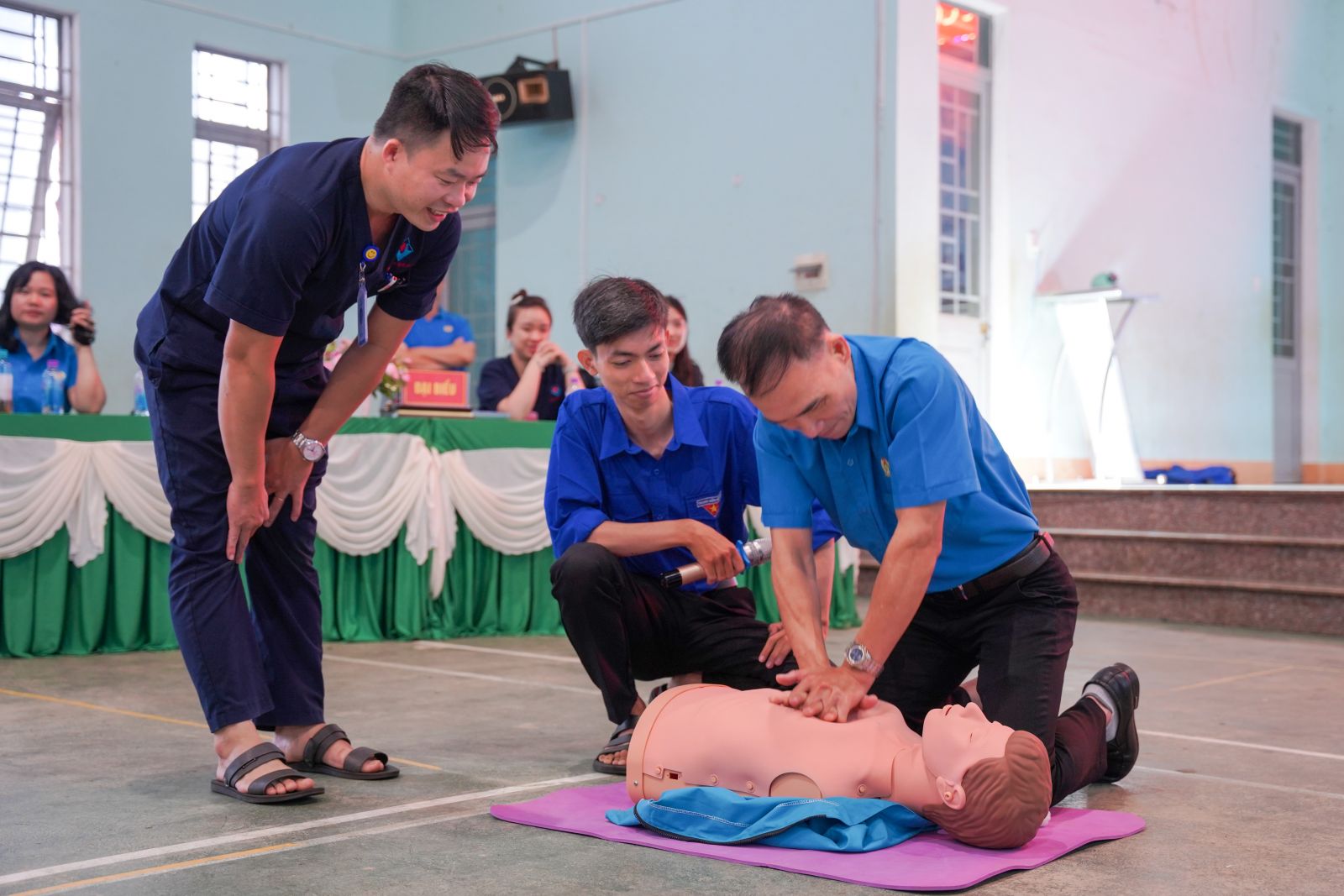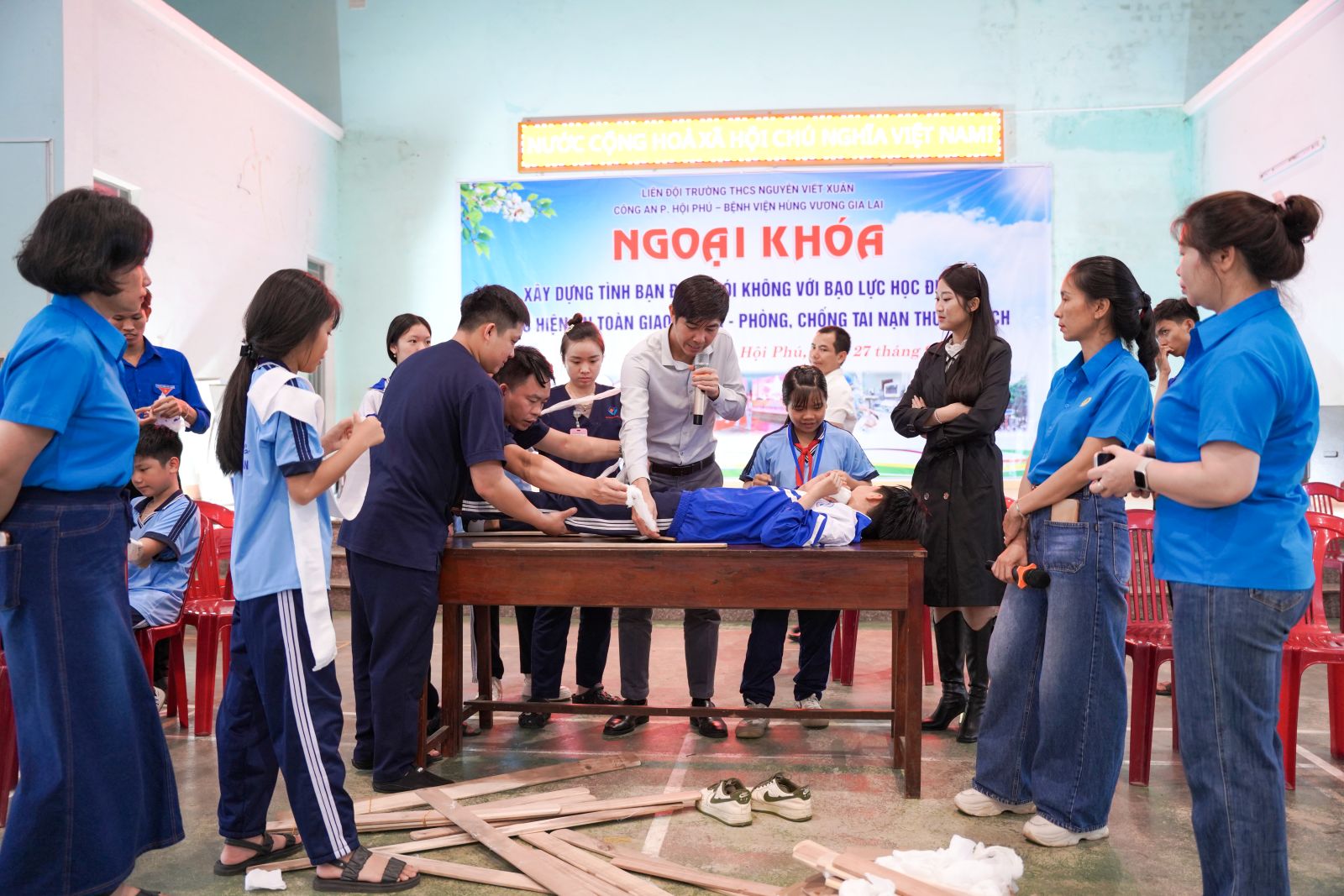 Trong buổi tập huấn, các bác sĩ và điều dưỡng của Bệnh viện Hùng Vương Gia Lai đã truyền đạt những kiến thức thiết thực, gắn liền với thực tiễn học đường như: Nguyên lý sơ cứu, cấp cứu tại chỗ, phương pháp vận chuyển nạn nhân an toàn, kỹ năng sơ cứu khi ngất xỉu, cầm máu, gãy xương, điện giật, hóc dị vật, xử lý bỏng và đặc biệt là kỹ thuật hồi sinh tim phổi (CPR).