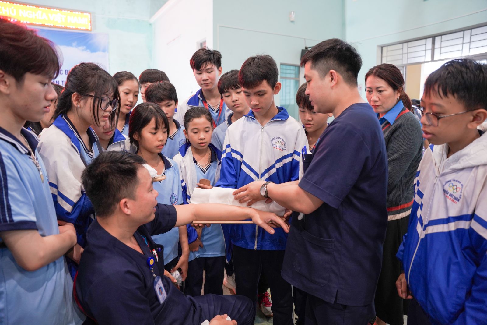 Điểm nổi bật của chương trình là học viên không chỉ được trang bị kiến thức lý thuyết mà còn trực tiếp thực hành trên mô hình và tình huống giả định dưới sự hướng dẫn tận tình của đội ngũ y tế. Nhờ đó, các giáo viên và học sinh đã có thêm sự tự tin, kỹ năng cần thiết để xử trí ban đầu đúng cách, hạn chế rủi ro trước khi chuyển người bị nạn đến cơ sở y tế.